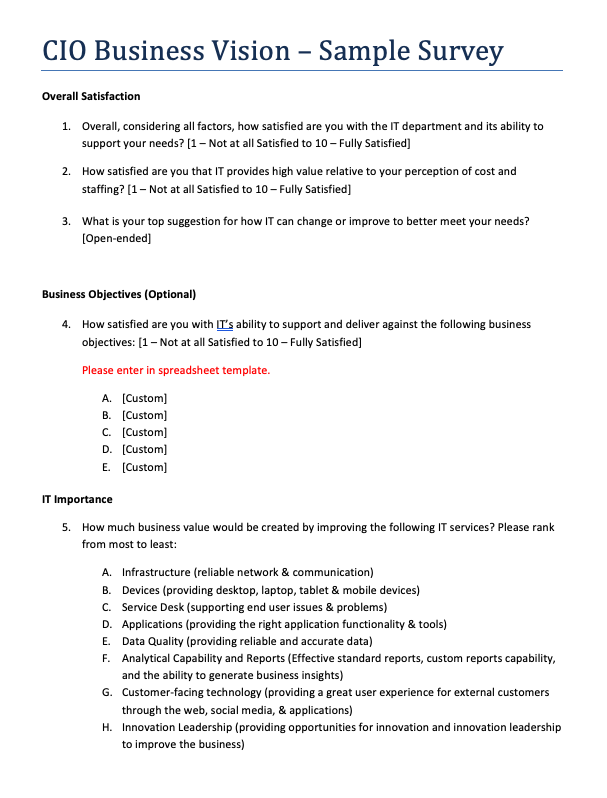 Info-Tech's core CIO Business Vision is set up to apply to all organizations. Download a sample of the survey and report card you will receive from Info-Tech's core offering.