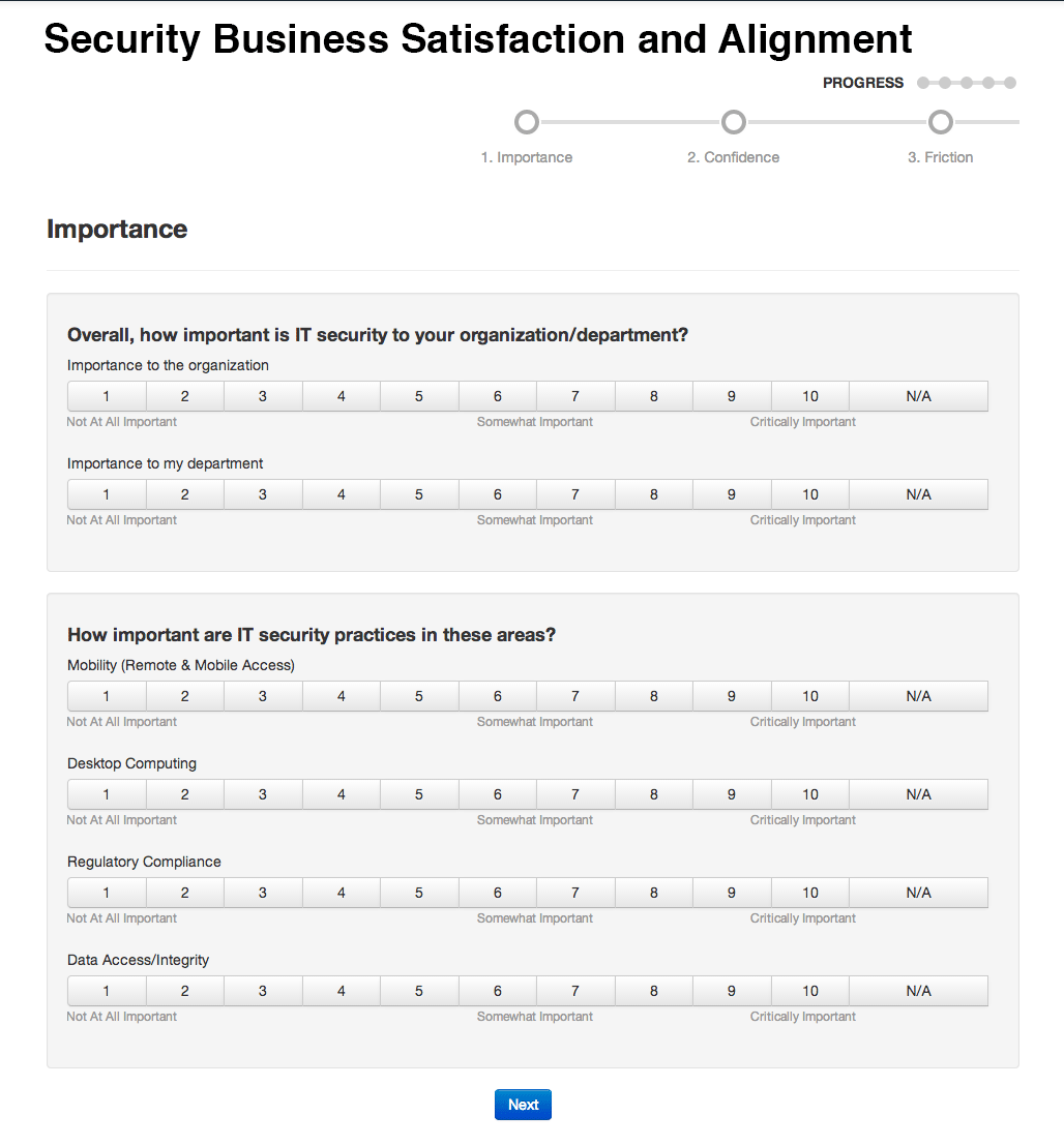 Preview a sample of Info-Tech’s Security Business Satisfaction and Alignment survey. This short survey (8 questions) is designed to be quick and user friendly. It should be completed by IT Management, Business Management, and a sampling of your End Users.