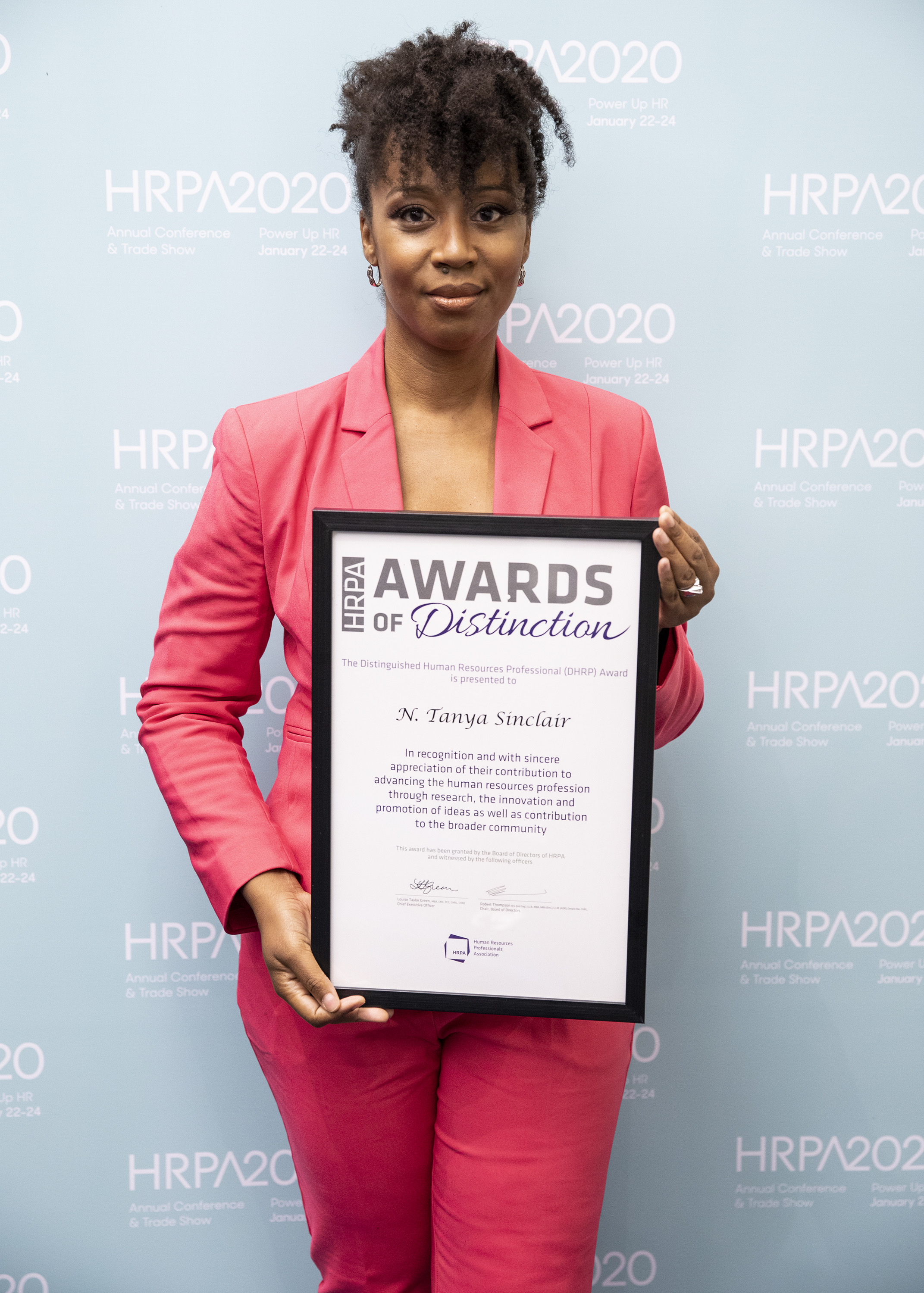 Receiving the award and being the first Black woman to receive it was very meaningful, such an honor. Just last week I had someone say to me, “Tanya, I am so pleased to meet you! I was sitting in the HRPA conference with thousands of people last year. I saw a confident Black woman in her natural hair wearing a fuchsia suit get up on stage to receive the Distinguished HR Professional Award when there were hardly any of us [Black women] in the audience!” Oh my goodness, to think that getting the award meant something to younger HR professionals means a lot to me. To have them see “that could be me.” People coming up to me and saying, “I don’t know you, but I am so proud of you.” Wow! It is so meaningful when you can see and celebrate the accomplishments of others together. I know I feel that way when others share their achievements, and now it is my turn.