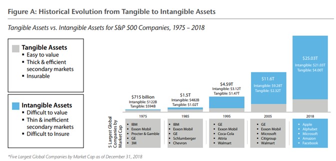Over the last 50 years we have seen the rise of intangible assets (including human capital) making up more and more of organizations’ value and in some cases becoming their most valuable assets. Compare below the top five global companies by market capital in 2018, including Alphabet, Google’s parent company, with most of their assets being intangible assets, to the top five companies in 1975, including Exxon Mobil, an oil and gas company, whose assets were almost entirely tangible.