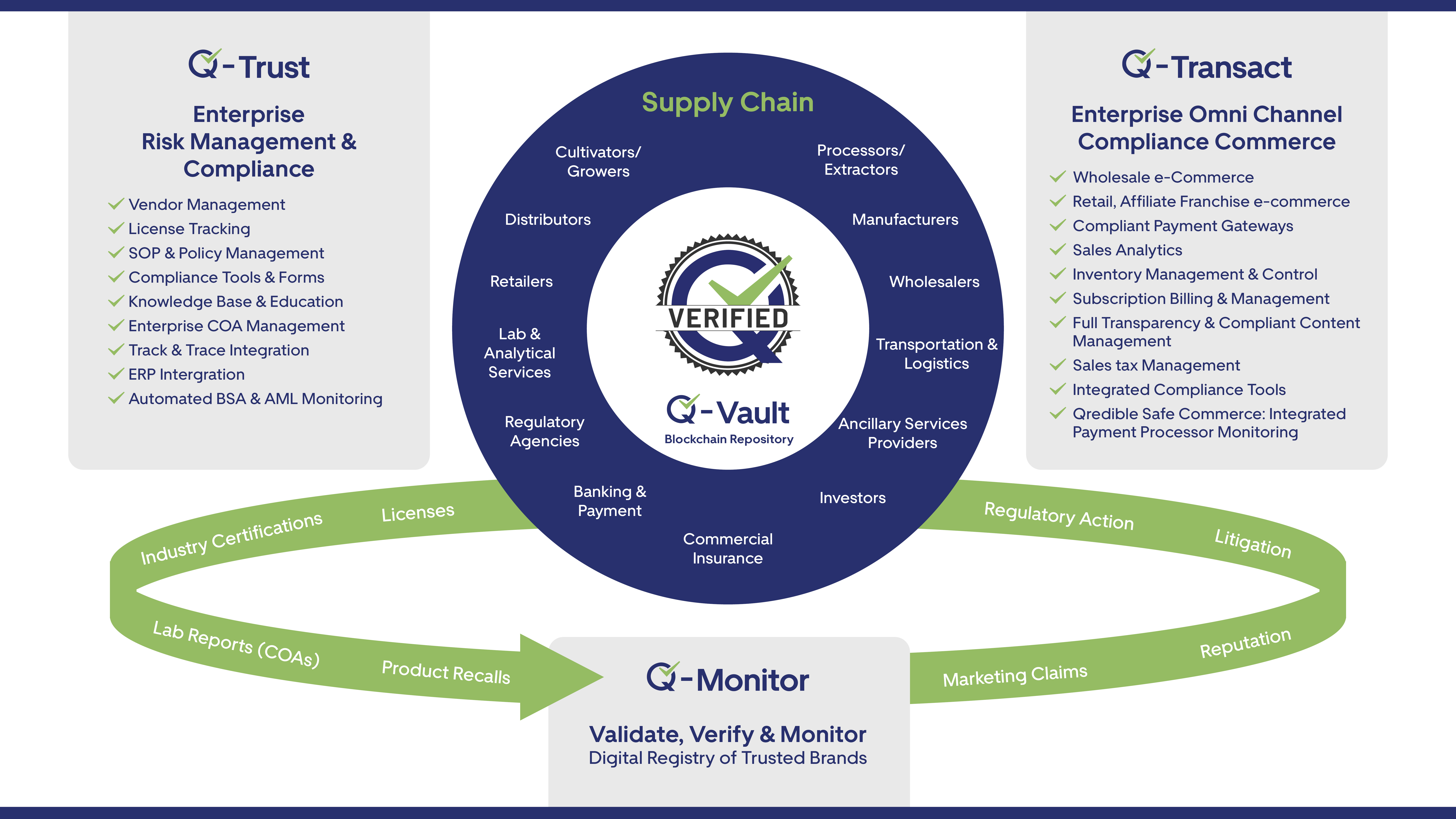Q-Trust is a cloud-based product compliance management automation system and merchant monitoring solution designed for companies in regulated industries. Our platform connects every player in regulated industries—retailers, distributors, manufacturers, labs, financial institutions, commerce platforms and regulators—into a unified system of verified truth.